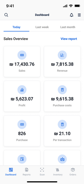 Dashboard screen - One place to track and control all sales data and inventory in real-time.